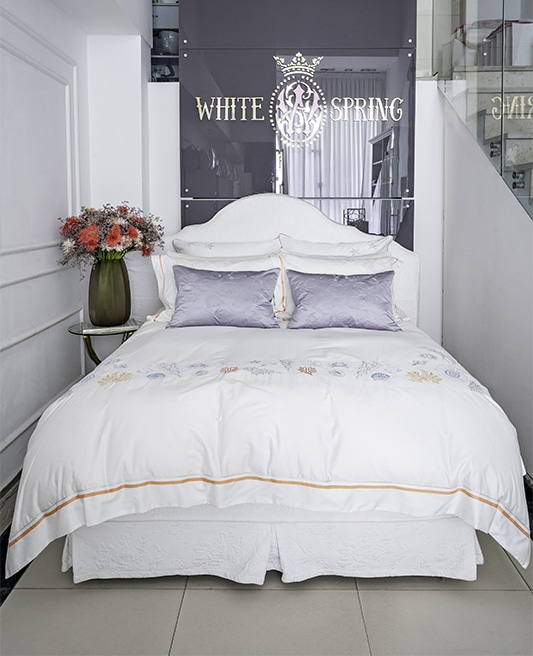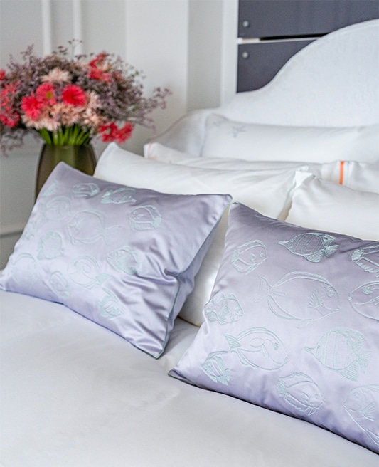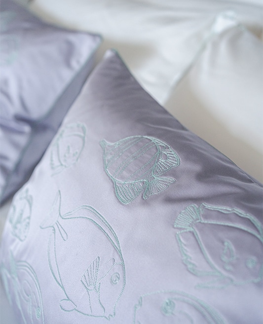 The “Aqua Gleam” Decorative Pillows are the latest addition to the “Serenity Seascape” Collection, enhancing the ensemble with their soft, light lavender satin finish. Embellished with exquisite aquamarine fish embroidery, these pillows blend luxury with the serene beauty of the ocean.