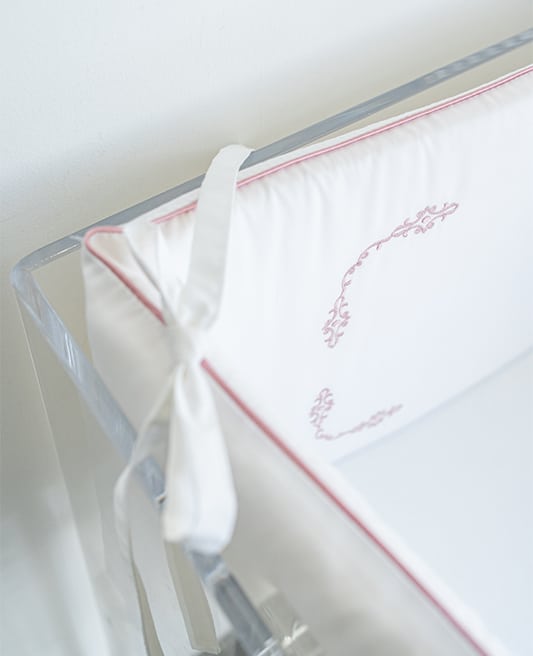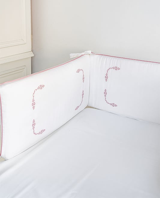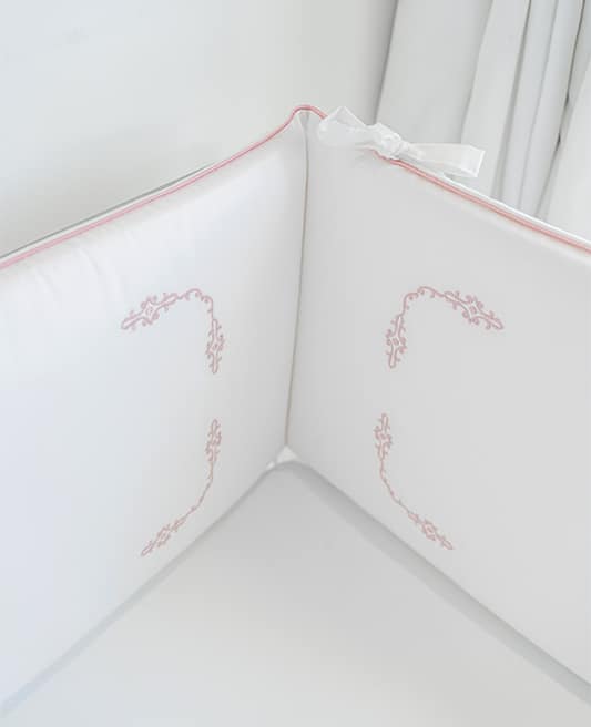 The bumper attaches securely to the crib with ties, ensuring safety and stability. Standard sets cover half the crib for targeted protection, with an option to order a full-surround version for all-around safety by selecting the full-size dimensions. This feature ensures adaptability and convenience for parents, maintaining the “Vintage Blush” Crib Bumper’s beauty and practicality.