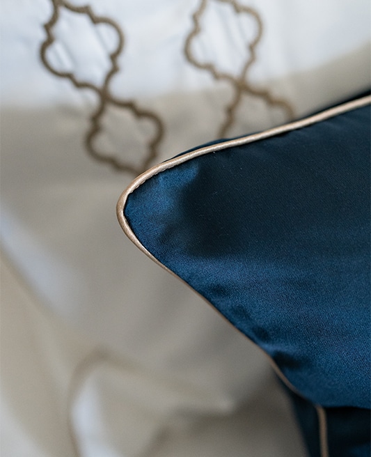 Surrounding this central emblem is a circle of bronze thread embroidery, adding a layer of sophistication and depth to the design. The pillow is further defined by a fine bronze piping along its edges, echoing the luxurious aesthetic of the “Elegant Diamond Oasis” Collection.