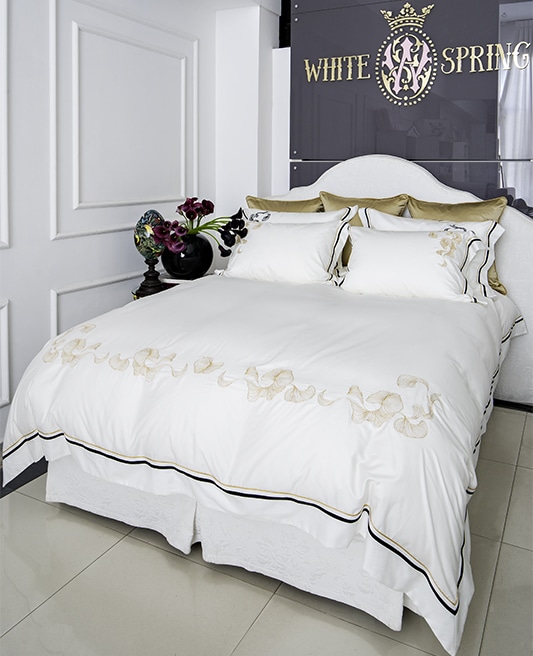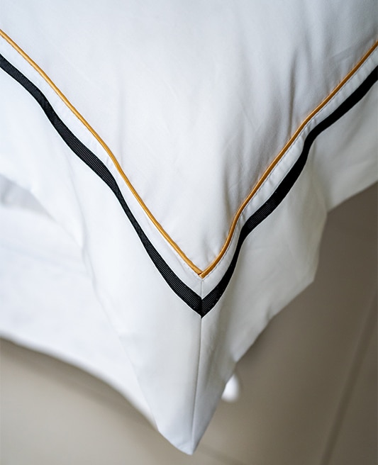 Dive into the heart of luxury with the “Kyoto’s Golden Whisper Duvet Cover,” a masterpiece that encapsulates the essence of refined living. Crafted from the finest Egyptian cotton sateen, known for its high-density weave and silky-smooth texture, this duvet cover offers an unmatched sleep experience. The base of pristine white serves as a canvas for the exquisite design that adorns its borders. Elegant stripes in a slender gold and a bold black encircle the edges, creating a stunning contrast that is both bold and beautiful.