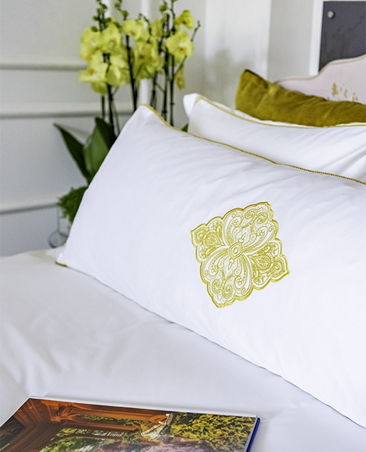 This “Damask” Embroidered Long Pillow is the ultimate additional decorative piece to complete your linen set. The Cover is removable and comes with the filling pillow (100% feathers).