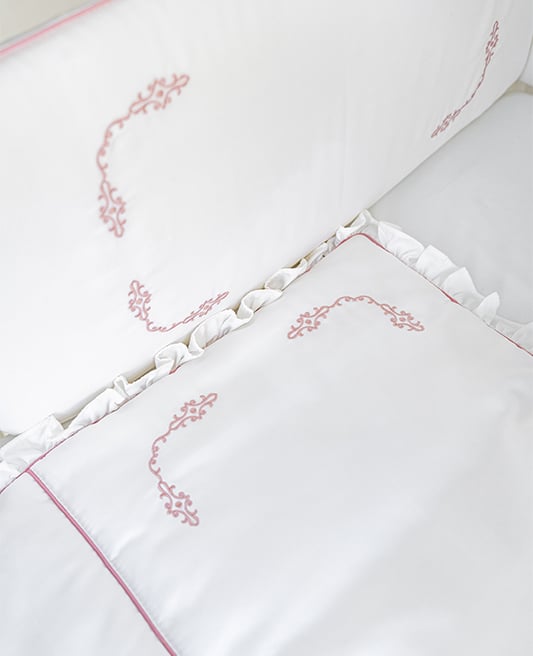 Embellishing the corners of the bumper and blanket are intricate embroideries in an antique pink hue, adding a touch of timeless beauty to the set. This subtle yet striking design is framed by a slender embroidery border, echoing the vintage pink motif for a cohesive and refined aesthetic. The “Vintage Blush” Baby Bedding Set is not only a testament to sophisticated nursery decor but also ensures a soft, serene sleeping environment for your baby.