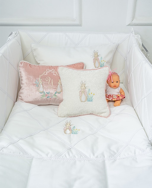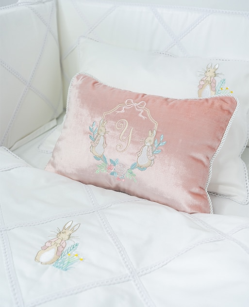 Made from luxurious blush-pink velvet, this enchanting pillow features an embroidered monogram surrounded by two charming Peter Rabbits, delicate florals, and a graceful bow — creating the perfect blend of elegance and whimsy.