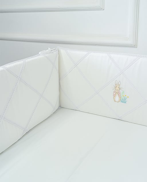 Crafted from 100% cotton sateen with a luxurious 500-thread count, this bumper combines comfort, safety, and timeless beauty. The delicate lace diamond pattern and pastel pink Peter Rabbit embroidery bring a touch of sweetness and sophistication to any nursery.